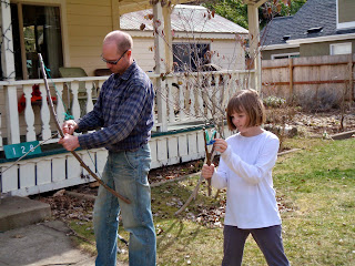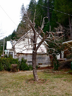 Of course this all happened when we were at the farthest point from the truck. A fine outing overall, but going out again wasn't that inspiring, so the next day, we attacked Linda's apple tree, which was in desperate need of pruning. Perhaps it is just my inherent tendency toward tree carnage speaking, but it was a lot of fun. I don't have a "before" picture, but at least the tree isn't heading for the power lines anymore, and we cleaned off many eye-poking hazards and one big branch that had been partially broken by a bear.
