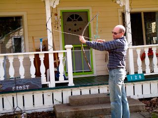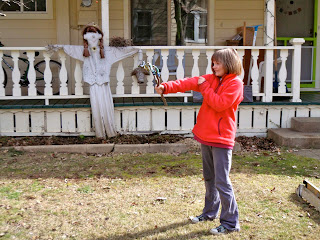 Apple branches = fun! Chad made a couple of toys, which made Nimue quite happy. Sadly, these particular activities probably are not recommended for the school garden club's pruned apple branches (even though the kids would like them a lot!)
