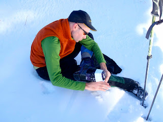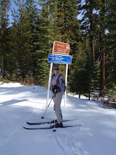 Based on a local report of conditions, we braved the cross-country trails off of Yuba Pass the first day -- but instead of taking our normal gear for yo-yo skiing up and down the hill off the road, we opted for lighter-weight cross-country gear. A wise choice in theory...except that Chad's lightweight boots date back to the late eighties and have lived a long and useful life. They've been reglued and repaired in the past, but that doesn't stop aging plastic fatigue.