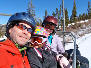 More laziness and good food, then eventually we headed over to Tahoe to downhill ski. As usual, we went to Sugarbowl. This turned out to be a good choice: there was plenty of snow on the groomed trails (some of it man-made) to do some fun family skiing, without having enough for me to either lead people astray off trail, or yearn excessively about escaping family responsibilities.
