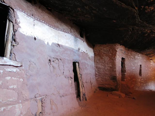One of the neat things about this set of structures is that many of the rooms are sheltered by a big hallway, which one is actually allowed to carefully go into. The hallway is painted with stripes and many small white circles, thus the modern name "Moon House".