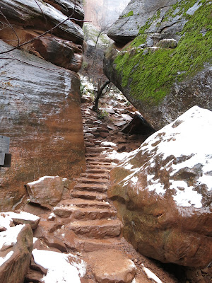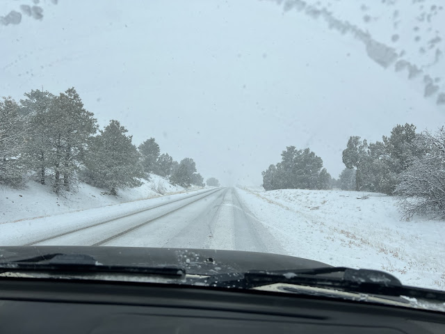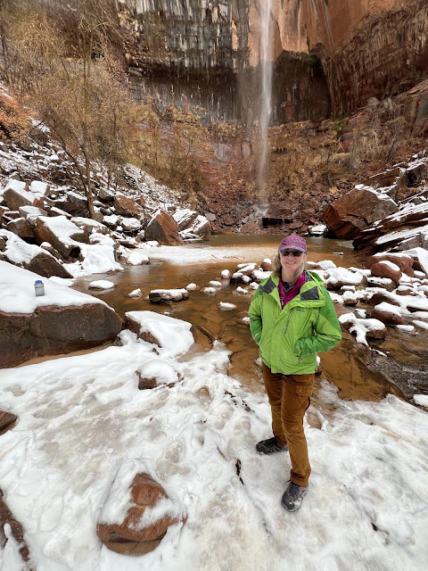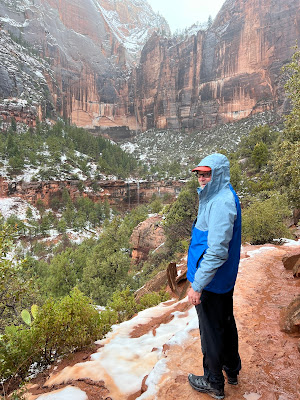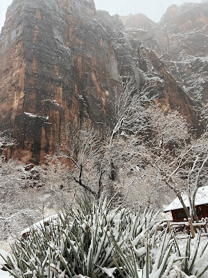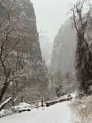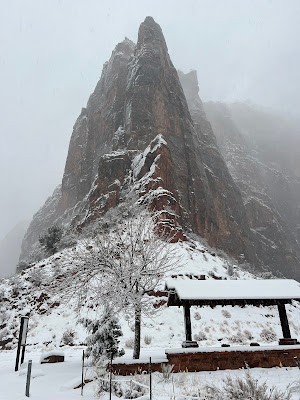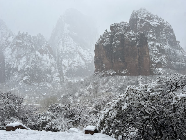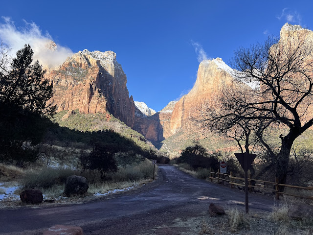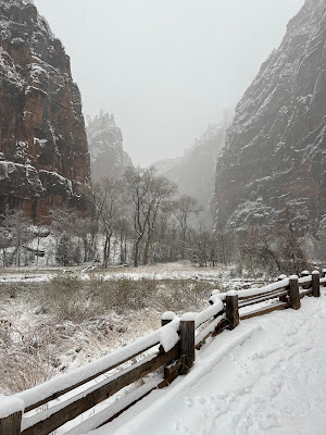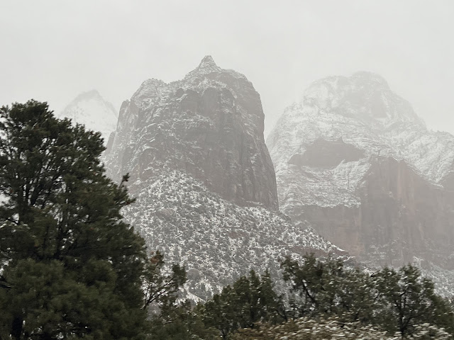 Ma February 14, 2025The next day, it was time to head into Zion, where I had booked us a room in the lodge. The snow was really starting to fall at this point, and we got almost all the way to the park on the approach from the east when we hit a road closure, necessitating an hours-long detour to enter from the other side (darn that coffee stop in Kanab?).