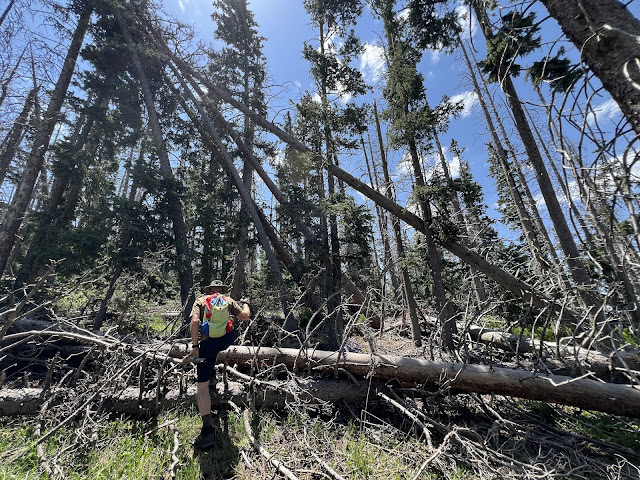 This should be easy, as there is nominally a trail to the top. Trail reports indicated there was some significant windfall, so we weren't sure what to expect -- so we loaded the nominal trail into the GPS and headed up to scout.