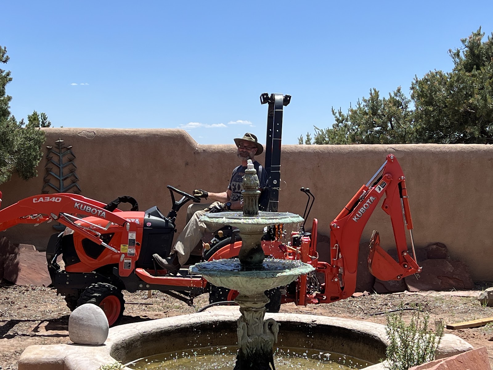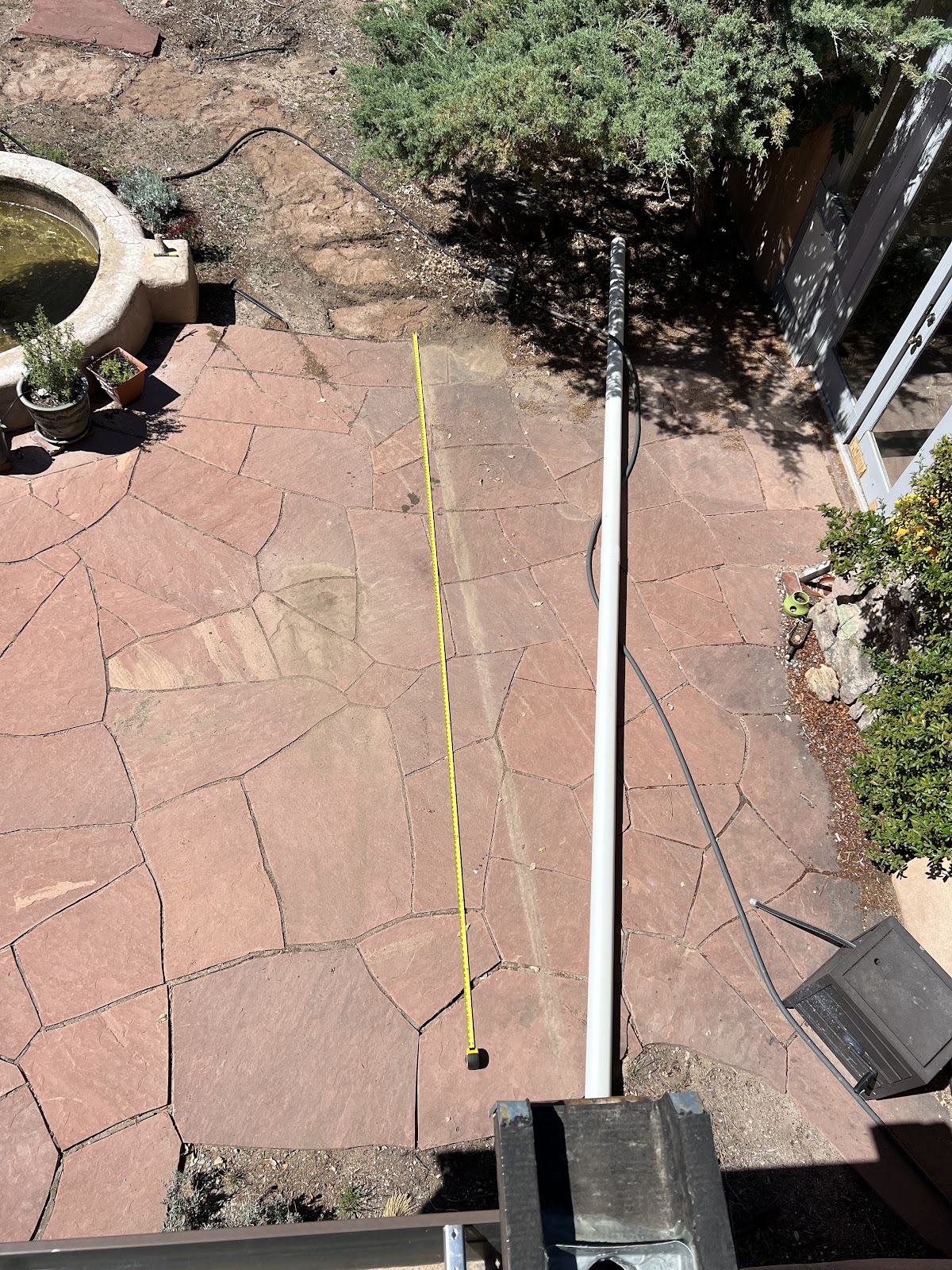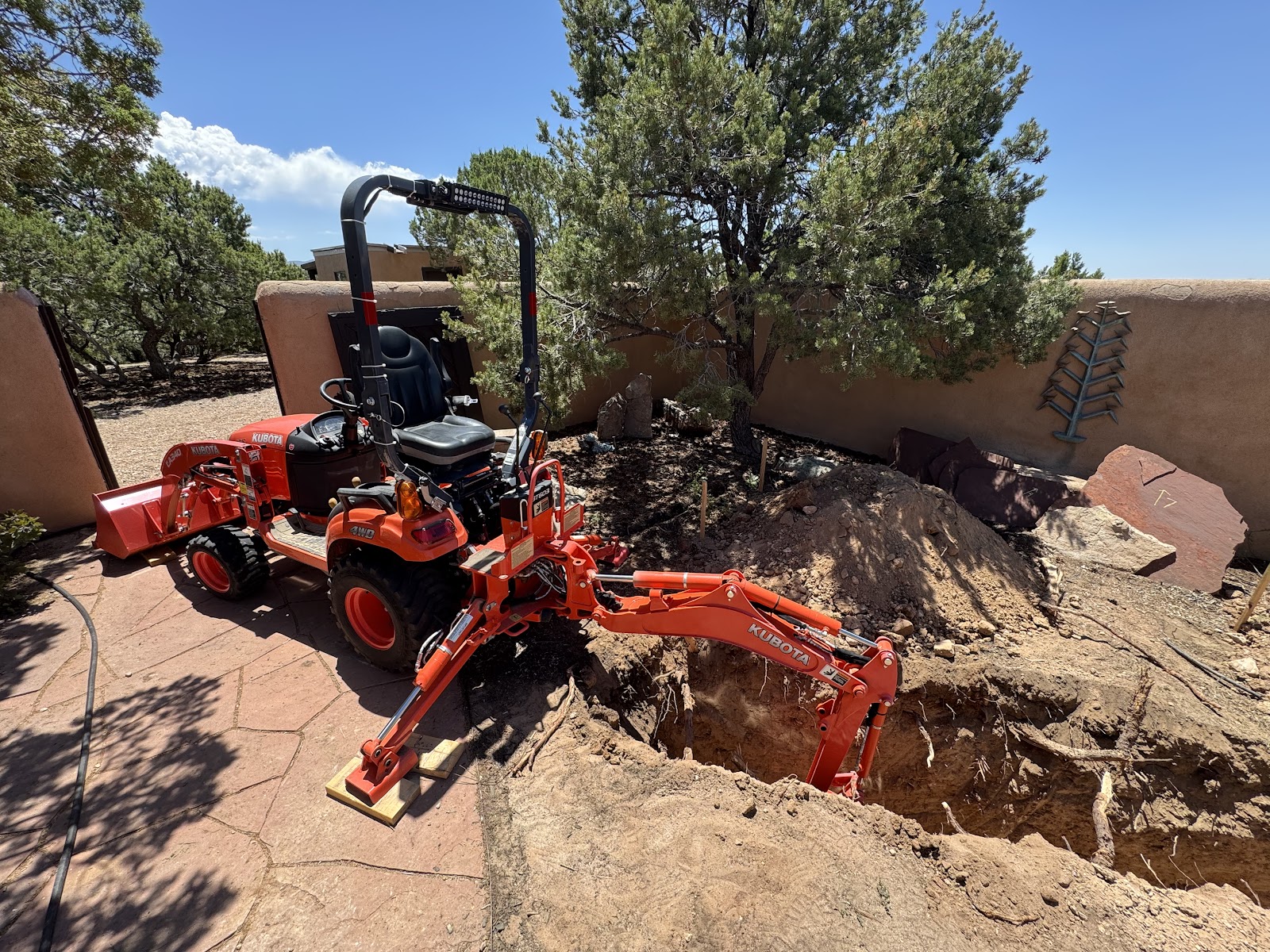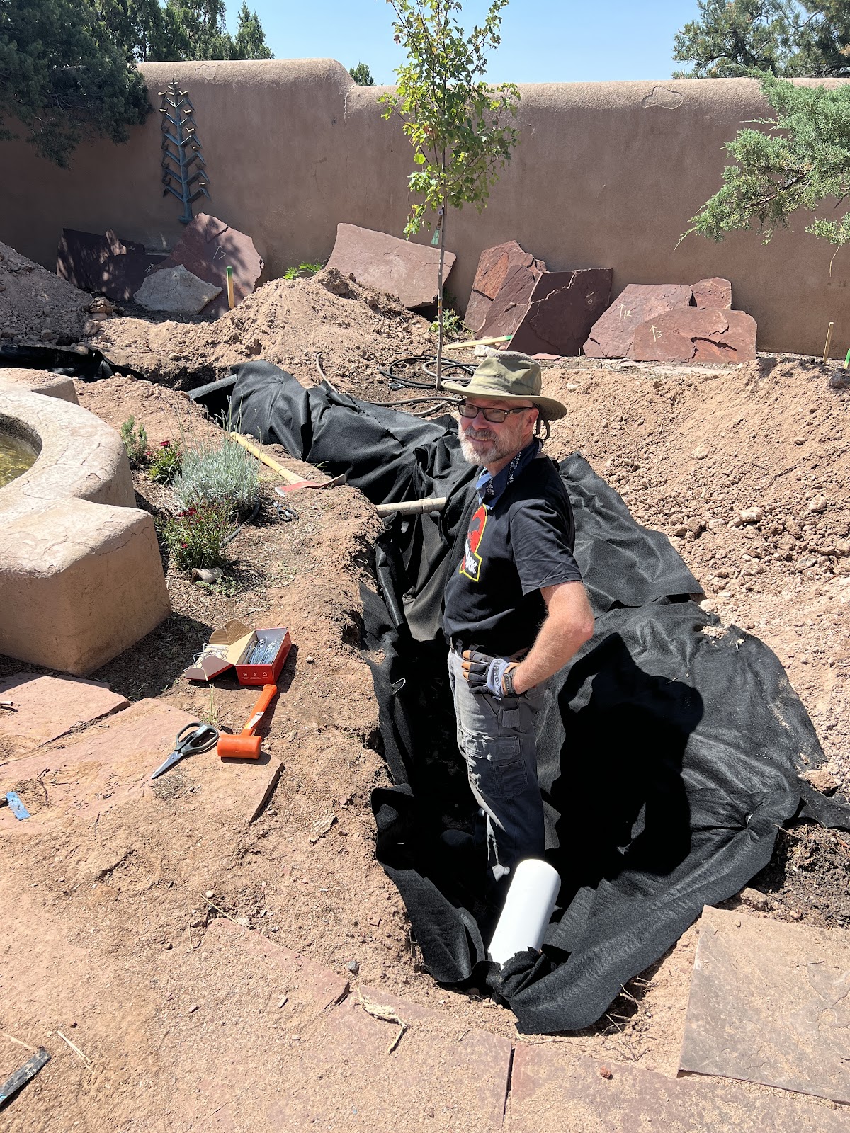 BikeBoy July 14, 2025 #house #projectsWe built a pumice wick in our back courtyard! This is something we've been planning for a while to mitigate the water than pours off the roof when it rains, but getting everything lined up to actually do the work took some time and careful consideration. Several patio flagstones had to come up -- how to keep track of their placement and orientation, so they'd go back where they came from? Will the tractor fit through the gate (and if not, are we willing to dig this by hand?) How much pumice will we need, where will it come from?