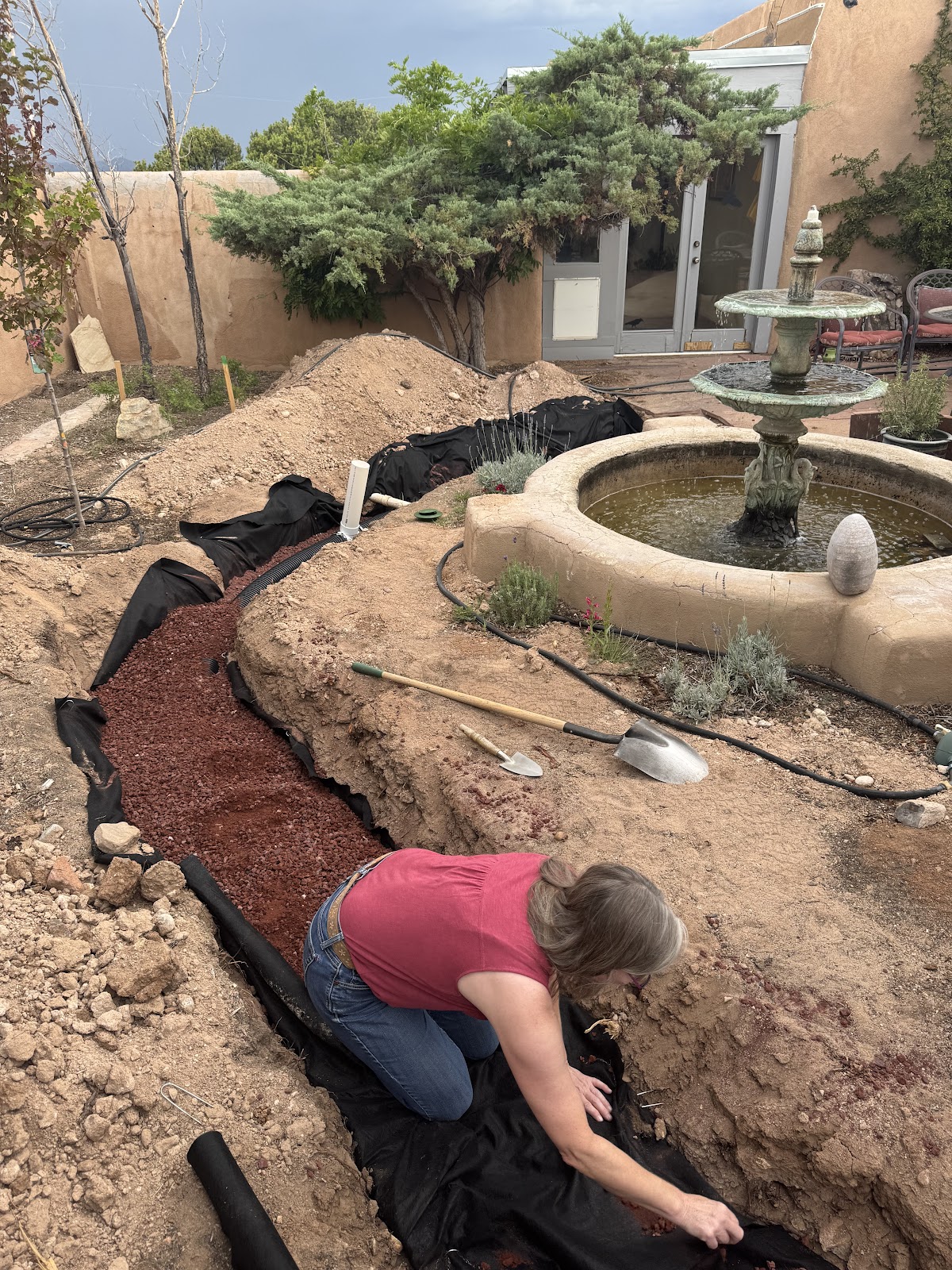 Last look before another layer of geotextile goes on, and then dirt, and then flagstones. You can't even tell now, that there was ever a big trench there!