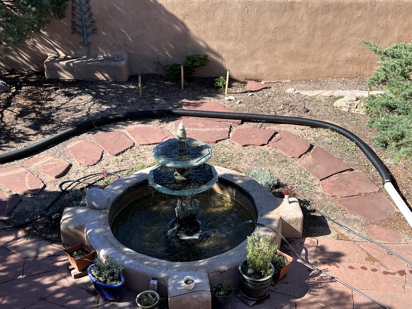 The trench is going to go right under those flagstones, they'll all have to move. The black pipe is perforated, and will allow water draining off the roof to flow into a bed of highly absorbent pumice rock. The water will then be able to slowly percolate into the ground, supplying moisture to the surrounding vegetation.
