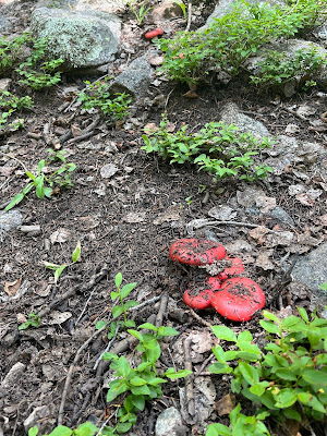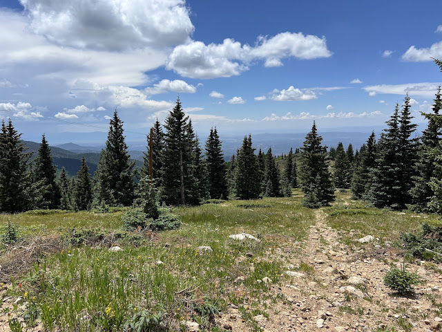 Ma July 21, 2025Kean is visiting, but no one wanted to go on a steep hike with me this morning, so I went myself. Alamos Vista trail goes steeply up to the ski area, and provided a nice walk through the aspens, good views, wildflowers, and brilliant red poisonous mushrooms on my somewhat ill-advised route back down along the creek.