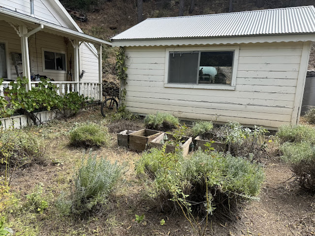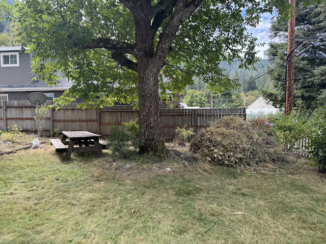 Let's start with the chores: we cleaned up the herb garden, pruned a bunch of trees, whacked back blackberries, and made a giant heap of detritus that can't yet go to the dump because they already have too big a pile there and aren't accepting more yard waste until after fire season is over.