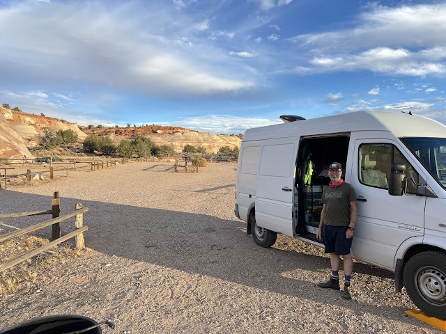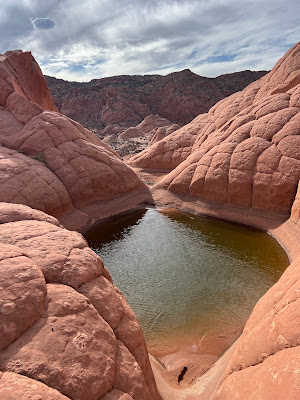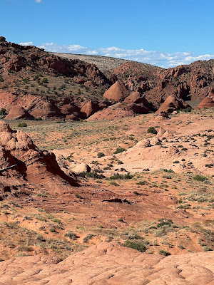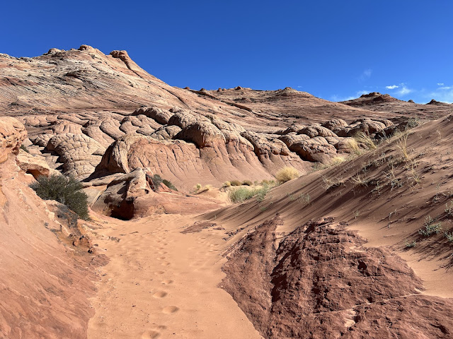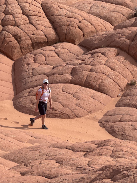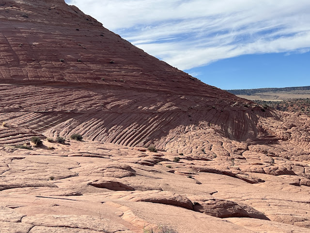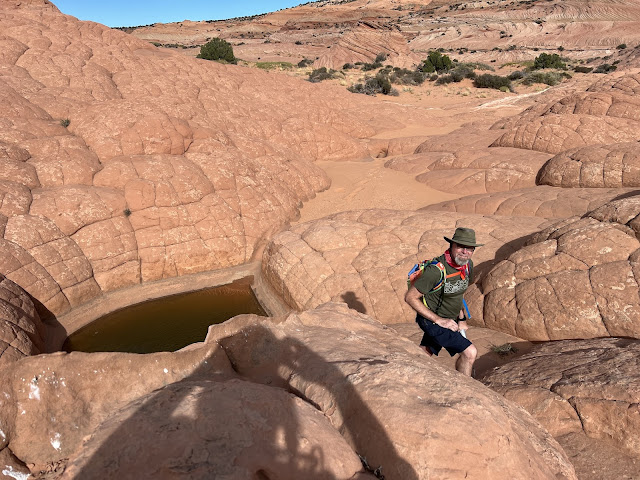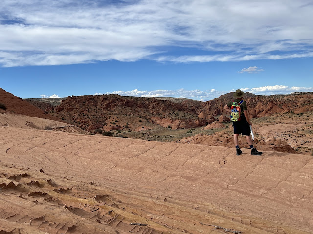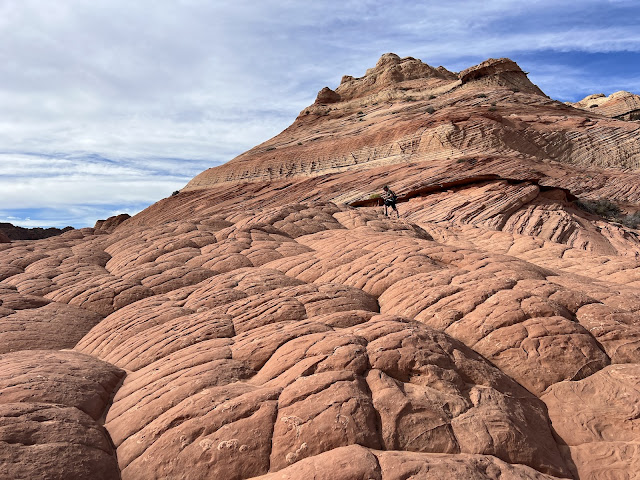 Ma September 22, 2025I've been trying to get a permit to hike The Wave in Vermilion Cliffs forever. Once again, no luck. Fortunately, there are plenty of other nearby rocks to explore; the hike today is a good case in point and was one I wanted to do back in February when we were last in the area. The weather was inclement then, but good today, so we got to play on the rocks.