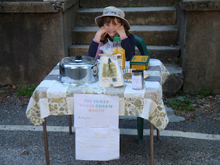 At any rate, she had a few, wanted more, and decided that selling chocolate chip cookies in Downieville was the way to make money more quickly than waiting forever for her allowance savings to build up. Being a Towle, she quickly set up the "Towle House" cookie booth, and smiled and waved at every passer-by until all the cookies were gone.