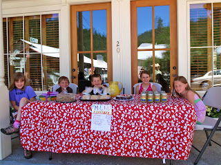 Part of the deal with us to allow her the second stand (these things do require parental/grandparental effort and resources, after all) was that she would donate some of her profit. She chose to give 25% of her take from both sales days -- $16.27 to be precise -- to the [Sierra Buttes Trail Stewardship](http://www.sierratrails.org/) operation that maintains the trails up in that neck of the woods. The woman who got the envelope was so tickled that she immediately took Nimue over to the race announcer, who not only announced her donation to the entire town, but also interviewed her over the very loud microphone. Linda could hear it all the way over at her house across the river! Nim was nervous, but spoke very well, and was clearly on a high, feeling famous, afterwards.