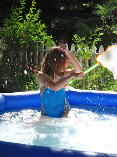Much water play. It was up around 90 degrees the whole time we were up there, so the kiddie pool, sprinkler, and mister were much appreciated. The first small pool suffered a large woe after being cartwheeled into one too many times, was resurrected as a circular slip-and-slide dance floor, and then replaced with a bigger splash pool.