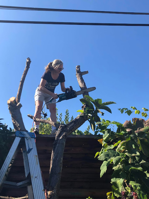 The sound of the chainsaw brought Chad outside to investigate, and naturally he chose to get in on the fun :) He took out the largest part of the trunk once I got the top stuff shaved off. So -- one more project knocked off!