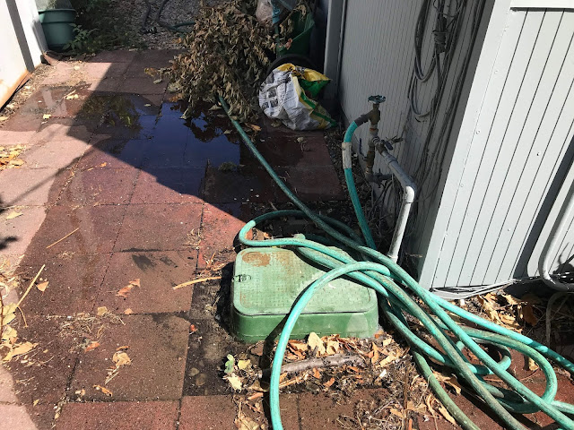 As is usual for these things, after we got home and started on the rebuild, Chad found we needed one more part. Fortunately, Lowes is right next to the climbing gym, so it was easy for me to pick up the critical bit of flexible hose later in the week, and Chad got the valve box all put back together, as well as fixing another leak elsewhere in the system. And, as an added bonus, while checking all the electrical connections to the controller, he figured out how to connect the sprinkler zone in the front courtyard, which has never worked. We had been told that zone was broken and hopeless when we first moved in over a decade ago and have been alternately running it manually or not using it at all ever since, not knowing all it needed was for a solid electrical connection to be made. Kudos to Chad for figuring that out and fixing it!