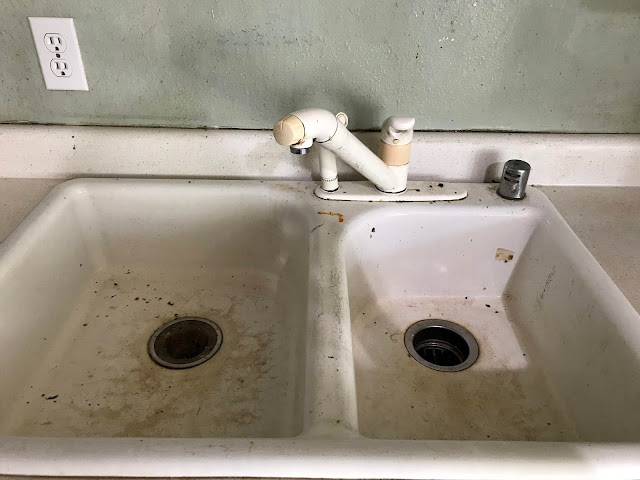 I have hated this sink ever since we moved in. It's ugly and stained, and worst of all, having the stupid divider right under the too-low faucet means you can't actually rinse out a large pot without getting water everywhere. Why on earth would anyone design a sink in which you can't get water to pour directly into the large basin?? The sprayer doesn't pull out far enough to be useful either.