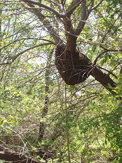 We had some excitement at BioSITE today -- a bee swarm took over one of our teaching sites midstream. Fortunately the facilitators did the right thing and immediately cleared themselves and the students out of the area; I then carefully went in and cleared out everyone's stuff while trying to ignore the creepiness of thousands of bees buzzing loudly around and above me (big hat, long sleeves and pants, and not allergic...). The attached picture is of the bees after they settled down into a large clump on a nearby tree branch.