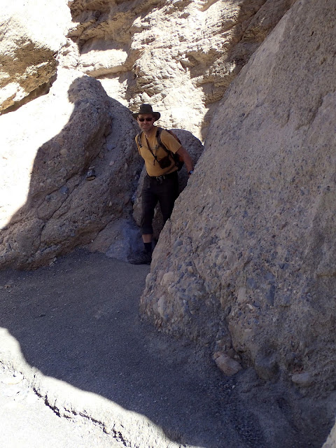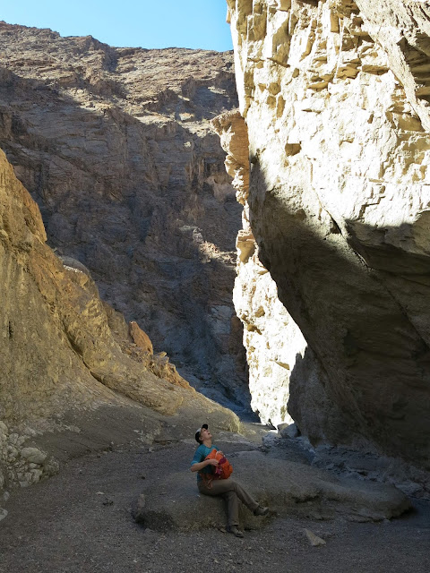 As I had suspected, after a while, I could no longer align what I remembered of the description of the canyon in the book with the reality on the ground. We were in a different drainage. No matter -- it is all fun! It eventually became clear that we were in a side drainage that sort of connected up with the more well-known Mosaic Canyon. We just took the scenic route away from those who don't favor hair-brained routes :)