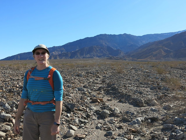 Since the hike had turned into a longer expedition than planned, on the way back down we took the easy route that followed the main Mosaic Canyon past the point where we entered it, and then scanned the horizon for the van. Can you see it? Knowing it was toward the left side of the alluvial fan coming off the far mountains, we could, and started walking that way.