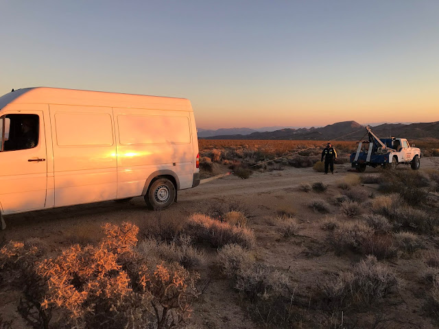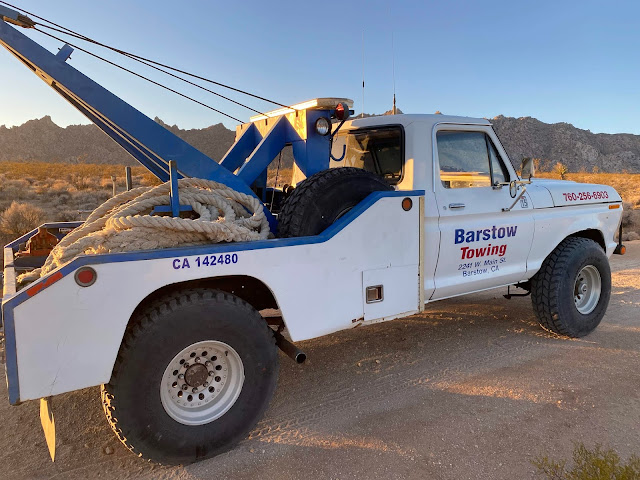 Tony the tow truck driver from Barstow was wonderful. He showed up about a half hour faster than projected, with his 4WD pickup on the back of a flatbed truck.