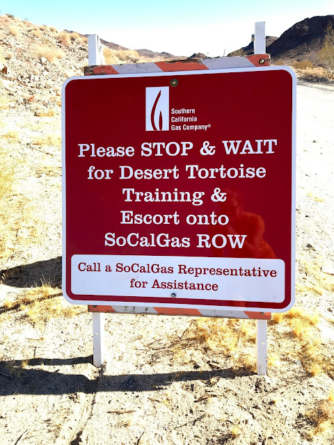 What I hadn't told Chad the night before was that the little short piece of dirt access road was another pipeline road....I had good info that the piece we would be on was short and in good condition, and just wanted to stop for the night. Fortunately, the only side effect was a little bit of truck traffic in the morning from the training and work they were doing that day (yes, upon seeing this sign all I could picture was tortoises fleeing from the rumble of noisy trucks). The previous 24 hours had not been the planned vacation day, but were certainly memorable!