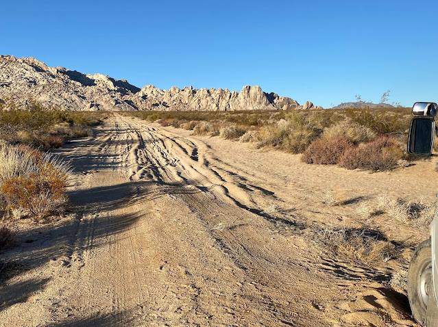 Then it got sandy. "How far in are we?" "About a mile and a half." Argh!!! If it was the correct road, we would have had a turn by then. And by this point, I can tell that while it is going towards intriguing pointy mountains, they are the incorrect intriguing pointy mountains. We don't want to take the van into that sand, plus I'm now 110% sure it is the wrong road, so time to turn around.