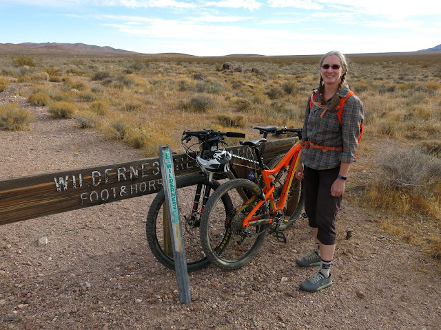 We locked our bikes to the same obscure wilderness sign as before to go look at petroglyphs. Somehow, we forgot how much of a walk it was down to the rock art, so Chad got to hoof it in shoes with bike cleats in soft sand further than he bargained for. (I ride in flat mountain biking shoes, without the connected cleat, so had an unfair advantage in this case.)