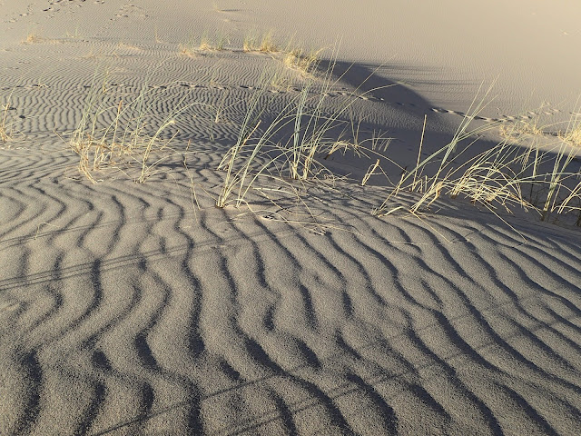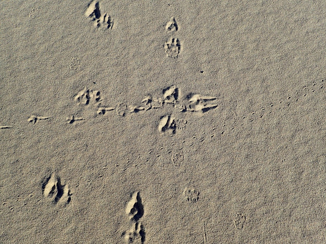 Footprints! The late afternoon light revealed the marks of many, many small feeties in the sand.