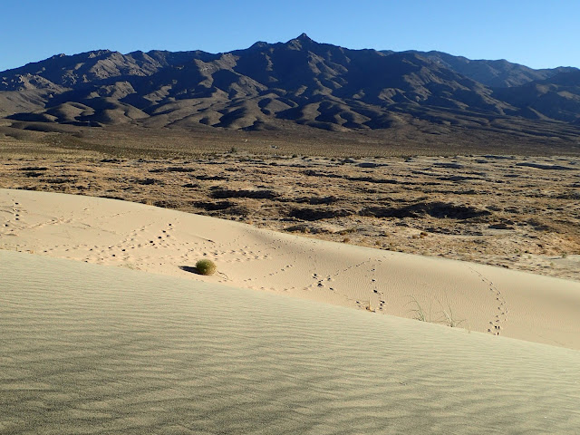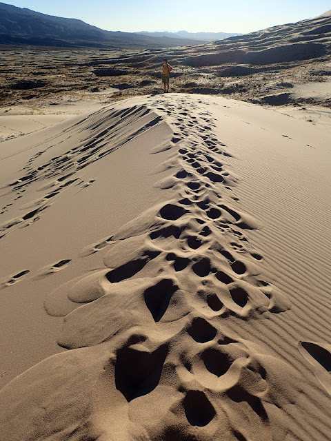 Hoofed prints, many-toed prints, squiggly prints, little stick prints. Imagining who made the many prints, and wondering where they were all hiking, kept us amused as we slogged up the dune.