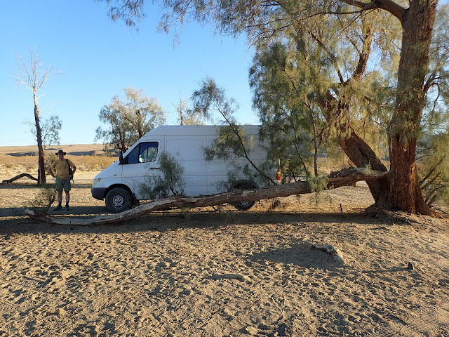 Camping is allowed near the dunes, and we got lucky enough to score a spot under the only big tree for miles. We had first set up somewhere else, but by the time we were ready to go on our hike, the people previously parked under the tree were gone, so I ran over and guarded it menacingly until Chad moved the van.