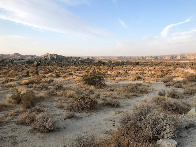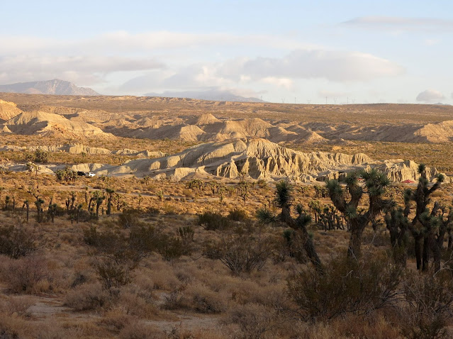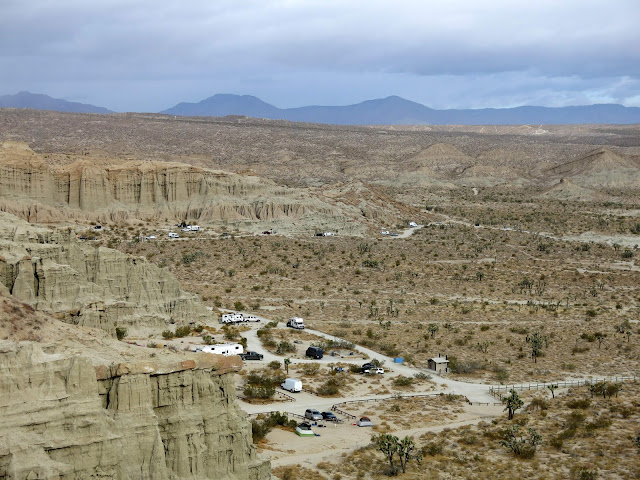 The next morning, we headed up the cliff trail to take a look at the views. In one direction you can see how the camp sites are all set up amidst the Joshua trees along the cliff.
