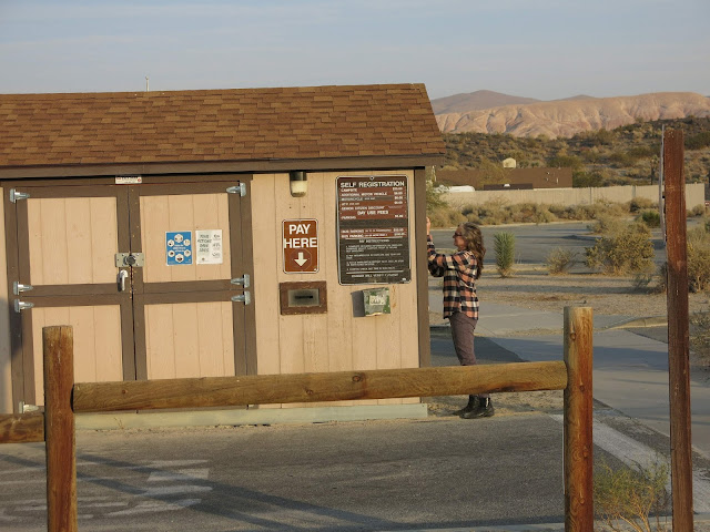 We got there around 4 pm, half an hour before the sun went down. Sunset is early this time of year. This campground turned out to be really cool -- most of the the sites are tucked up agains a long eroded sandstone cliff -- and they did have spaces left, so we grabbed one.