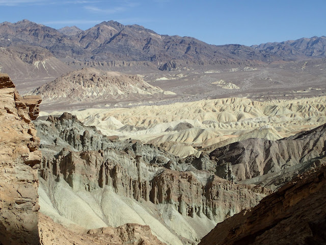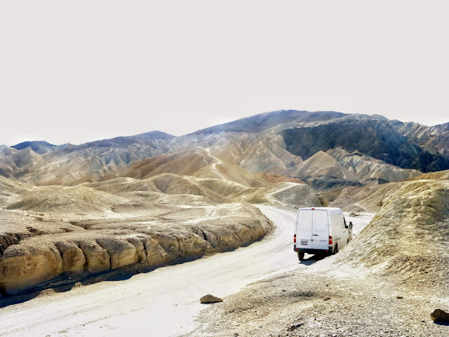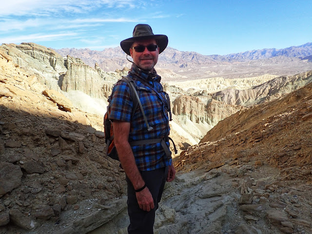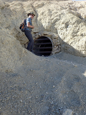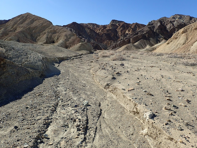 We parked in the widest spot we could find in the narrow one-way road near the drainage, after passing some confused people going the wrong way down the road because they got freaked out by one short steep pitch up ahead. (It wasn't that bad, but some drivers are skittish...) The flat spot on the left side of the road where we parked was apparently the site of the Monte Blanco assay office during the mining days. That building has since been moved down to Furnace Creek and now houses the Borax Museum, which we did not visit due to wanting to avoid interior spaces at this particular point in time.