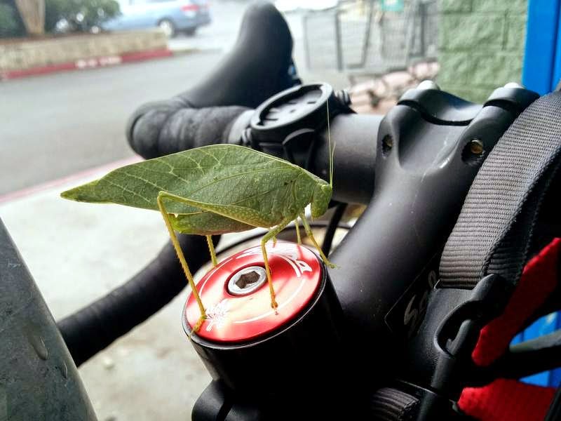 Ma November 15, 2014 #natureI found this fellow had invaded my bike upon coming out of the grocery store the other day. He didn't want to relinquish his position on the cockpit of the bike; I finally had to push him on to a scrap of paper and transfer him over to the nearby bushes.