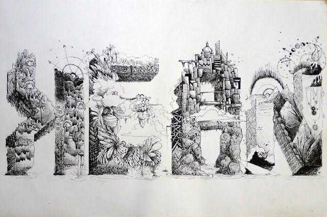 In contrast, her output these days is much more sophisticated (but still pretty entertaining), as her most recent assignment for art class shows. It's worth clicking on to enlarge it to look at all the little details of the drawing.