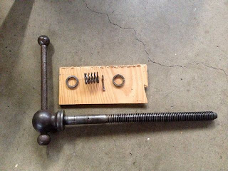 The handle and screw come out with the removal of a cotter pin, accessed from below. There's a bushing on the handle end, followed by a spring, another bushing, then the pin (1/8 in x 1 in).