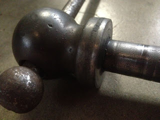 The plating on the handle is mostly gone, there's a little pitting but otherwise good. The handle is completely straight, unusual on a vise... and a good sign it hasn't been abused. There's some remaining grime shown here that I subsequently cleaned up.