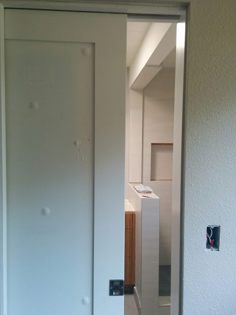 the pocket door was installed (note that there is still a protective layer of paper over the full-length mirror so you can't see it),