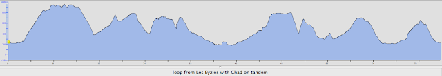 75 mile tandem loop from Les Eyzies, France: < 4000 feet climbing (note that the top marker on the scale here is less than half that of the profile above; these lumps are about as tall as the little second lump above)