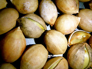 Fun toasty smells ensued. After about 30 minutes, I pulled them out and shelled them, as they had started to brown and I didn't want to overdo it. At this point, I sampled one of the darker ones. Mmmm. Interesting toasty, slightly bitter, nutty flavor with underlying complexity reminiscent of chocolate. Chopped up, these would make a nice garnish on a number of things.