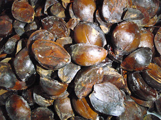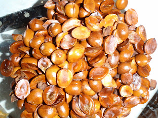 The fruit itself is pretty nasty (I tasted), but the nuts inside were what I was really after. After removing all the squishy bits, I tossed the nuts into the oven on a cookie sheet and started to roast them. After a few minutes, there was a bizarre noise -- the shells had started to crack and as a result, nuts were bouncing everywhere in the oven. I had to put a piece of foil on top to restrain the little buggers.