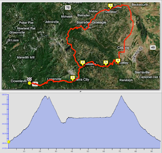 Since we couldn't make our usual June big ride in the Sierras (the Summer Solstice Century, in Quincy) this year, we decided to take a do-it-ourselves approach. We had planned to go up to Downieville for the weekend anyway, so we headed up Thursday night to leave Friday for riding, in advance of the weekend tourists on the roads.