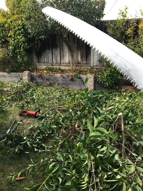 Unfolded, this thing is almost as long as my leg. Naturally, I found it necessary to engage in tree carnage. The overgrown oleander got to be the first target; the saw showed itself to be sharp in the way that only new blades are, and made short work of vertical spires that had gotten too thick to trim back with the loppers. If they saw me standing on the top of the back fence attacking the offending oleander, the neighbors surely have one more reason to think we have lost our marbles.