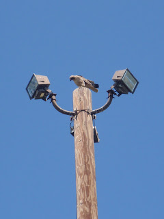 We had barely left the parking lot when we were treated to a raucous display of crows divebombing a big red-tailed hawk. This is the hawk after he found a perch that was acceptable to the squawking flock of others.