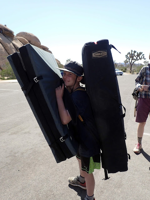 Scott, aka BeetleMan, carrying two crash pads.