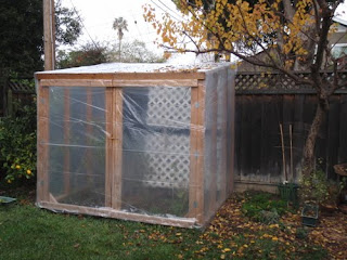 Chad built a most excellent cage to protect the garden from the evil thieving scum squirrels; we've now covered it in plastic to turn it into a greenhouse for the winter. This also provides entertainment, as the squirrels, as deft as they are, still cannot scale the plastic, no matter how hard they try. They keep trying, too...yesterday I watched two squirrels on the fence harass a third, who then took a flying leap onto the side of the structure, where it proceeded to slide ignominiously as its frantically scrabbling claws found no purchase. Ha.