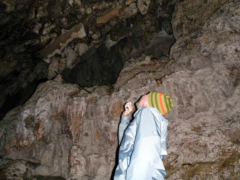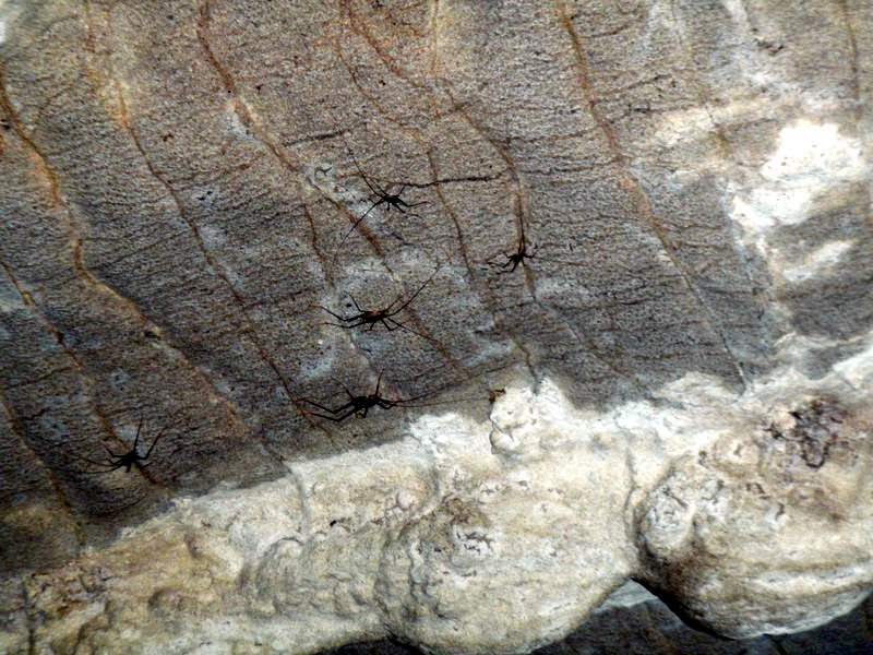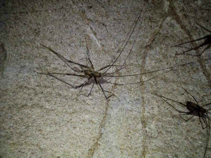 At one point, I shone the light upward and saw a bunch of giant bugs on the cave ceiling above us: