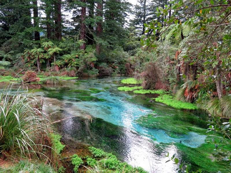 on the way to Hamurana Springs. The water that wells up here travels for 70 years through aquifers from the plateau to the south, somehow avoiding all the geothermal plumbing under Rotorua, and emerges from this 50 foot pit at a rate of about 4 million liters per hour.