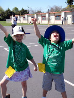 All the kids were wearing their matching green walkathon shirts (donated!), and began marching around the quarter-mile lap at 1:00 sharp. The older kids began to run as soon as they were allowed (after the first lap, so no one would get mowed right at the outset...), and I was impressed at how many of them went pretty much straight through until the course closed at 5:00. Nimue walked the first few laps with a group of girls from her class, but by about lap 4 had shifted to walking with her friend Jeffrey. They spent the entire rest of the afternoon together -- each taking breaks when the other needed water, bathroom, food, etc. Very sweet. When I asked Nimue what they talked about, she said "Stuff. And we were counting butterflies. There were 147!"