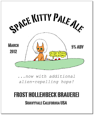 Ma March 26, 2012 #kiddo #chad #beerI happen to really like the label that Nimue and Chad created for Chad's most recent batch of beer. (For those not in the know, Space Kitty Commander #1155 Smudge Gizmo is Nimue's alter ego, who writes many of her school reports and shows up all over her drawings.)