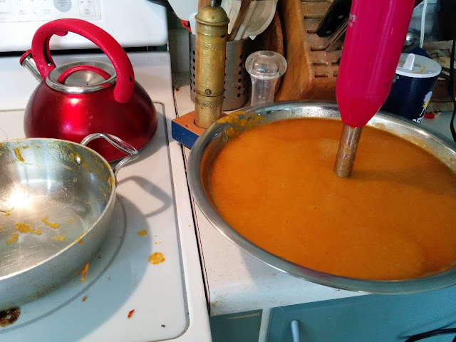 I wisely chose to do multiple smaller batches. Pictured is about 1/6 of the puree. Sticky goo everywhere.